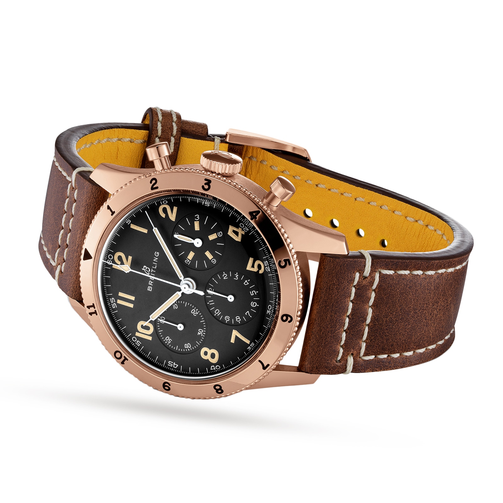Back in the 1950s, the original Co-Pilot Ref. 765 AVI starred next to another Breitling icon: the Navitimer. With its bold design, engraved rotating bezel and extra legible dial the 765 AVI instantaneously became the perfect companion to the Navitimer as the rugged and reliable pilots' watch. Today, the AVI 1953 Edition offers a luxury twist on the original design of the Co-Pilot Ref. 765 AVI from 1953. The all-black dial, protected by a highly-domed Hesalite crystal, has the same Arabic numerals than the original Co-Pilot, with tone-on-tone small second, 15-minute and 12-hour chronograph counters. The hand-applied Super-LumiNova color has been carefully chosen to recall the original luminescent material and gives the AVI 1953 Edition an additional touch of vintage allure. The AVI 1953 Edition features a 41mm 18k red gold case with a water resistance up to 3 bar (30 meters). The AVI 1953 Edition is powered by the in-house Breitling Manufacture Caliber B09, a hand-wound COSC-certified caliber based on the renowned Breitling Caliber 01. It is available on a brown vintage-inspired leather strap with an 18k red gold pin buckle as a limited-edition of 253 pieces, each of which is engraved "ONE OF 253".