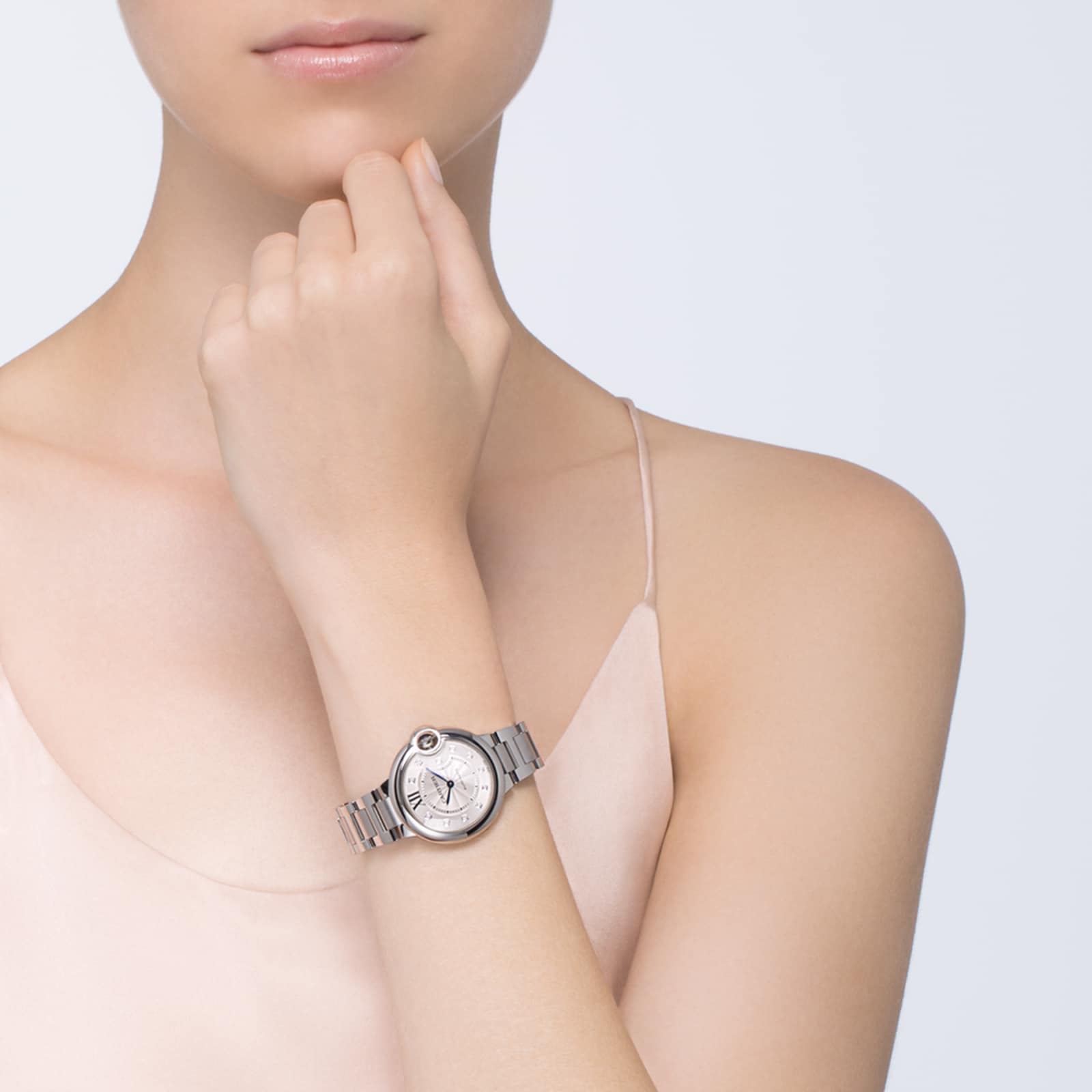 Floating like a balloon and as blue as the cabochon safely nestled in its side, the Ballon Bleu watch by Cartier adds a dash of elegance to male and female wrists alike. Roman numerals are guided on their path by a deep blue winding mechanism. With the convex curves of the case, guilloché dial, sword-shaped hands, and polished or satin-finish links of the bracelet...the Ballon Bleu watch by Cartier floats through the world of Cartier watchmaking.
