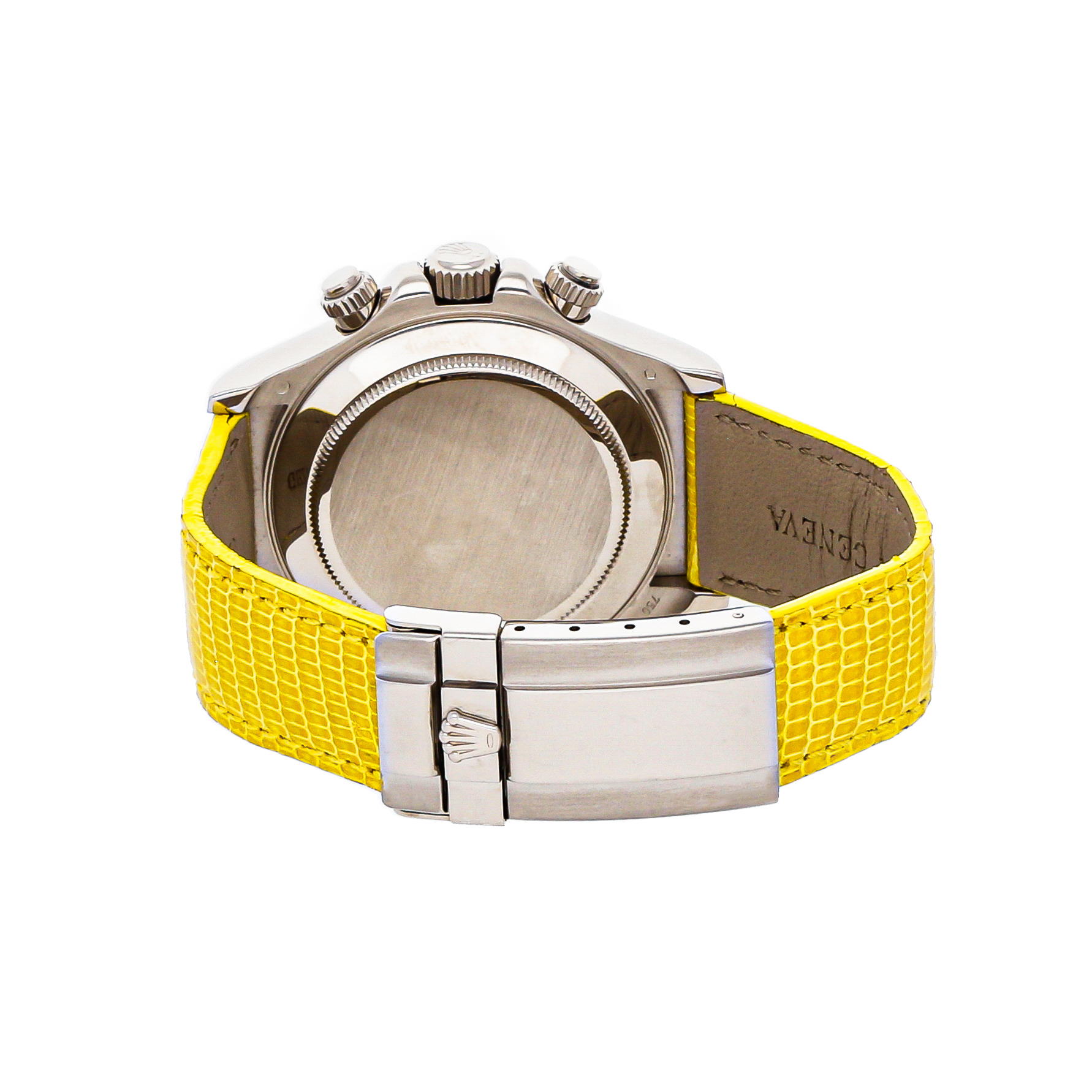 Pre-Owned Rolex Daytona Cosmograph (116519) self-winding automatic watch, features a 40mm 18k white gold case surrounding a gold mother-of-pearl dial on a yellow alligator strap with an 18k white gold deployant buckle. Functions include hours, minutes, small seconds and chronograph. This watch does not come with box or papers. Z Serial.We back this watch with a 2-Year WatchBox warranty!This watch will be ready to ship in 5-7 days!
