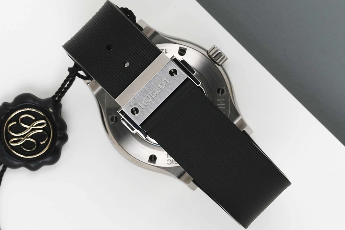 Titanium case with a black rubber strap. Fixed titanium bezel. Black dial with silver-tone hands and index hour markers. Dial Type: Analog. Date display at the 3 o'clock position. Automatic movement with a 42-hour power reserve. Scratch resistant sapphire crystal. Pull / push crown. Transparent case back. Case diameter: 42 mm. Round case shape. Deployment clasp. Water resistant at 50 meters / 165 feet. Functions: date, hour, minute, second. Luxury watch style. Watch label: Swiss Made. Hublot Classic Fusion Automatic Black Dial Titanium Mens Watch 542NX1171RX.