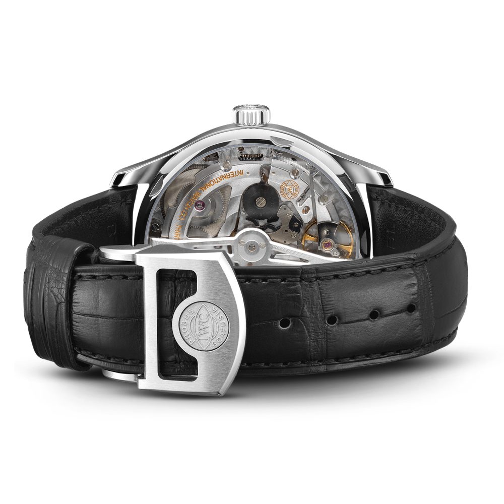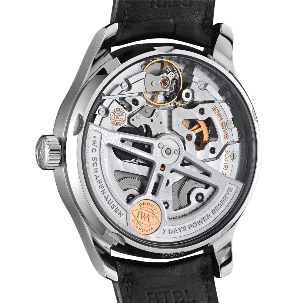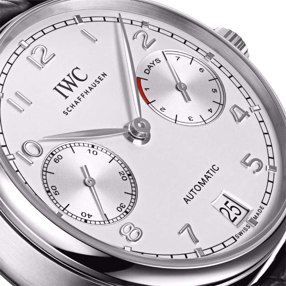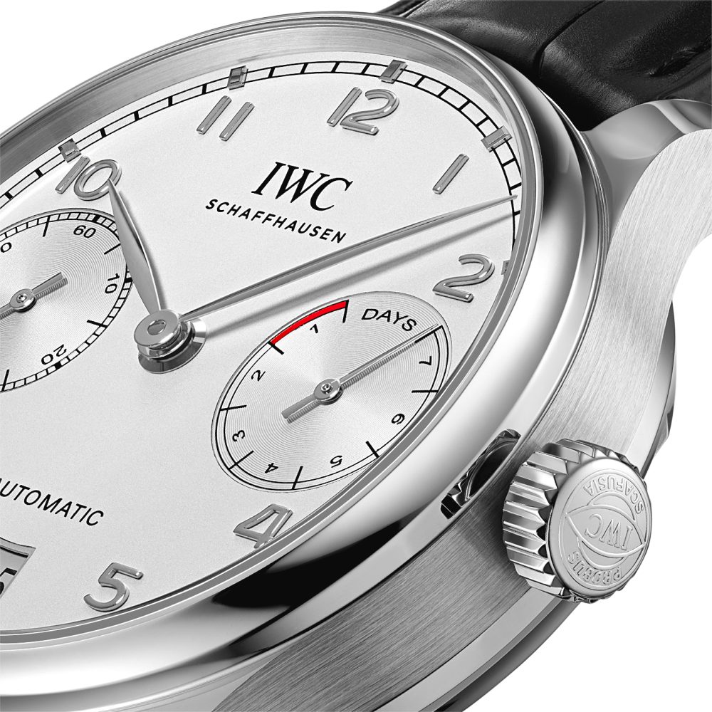 IWC Portuguese 7 Days 42mm in Stainless Steel on Black Crocodile Leather Strap with Silver Arabic Dial IW500712 Stainless Steel Case 42mm Case Size Automatic Movement Silver Arabic Dial Black Crocodile Leather Bracelet