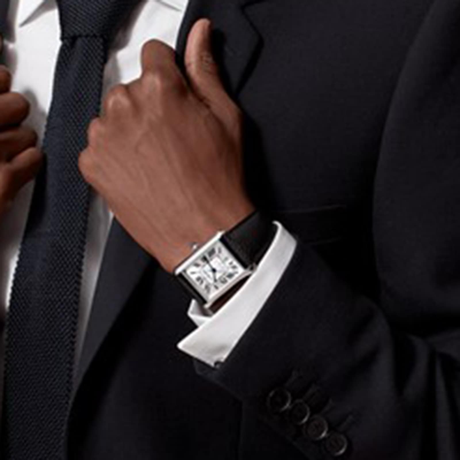 Tank Must watch, extra-large model, mechanical movement with automatic winding, calibre 1847 MC. Steel case, beaded crown set with a synthetic cabochon-shaped spinel, silvered flinqué dial, blued-steel sword-shaped hands, black grained calfskin strap, interchangeable steel folding buckle, calendar aperture at 6 o'clock. Case dimensions: 41 mm x 31 mm, thickness: 8.4 mm. Water-resistant to 3 bar (approx. 30 metres).