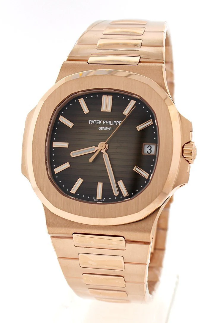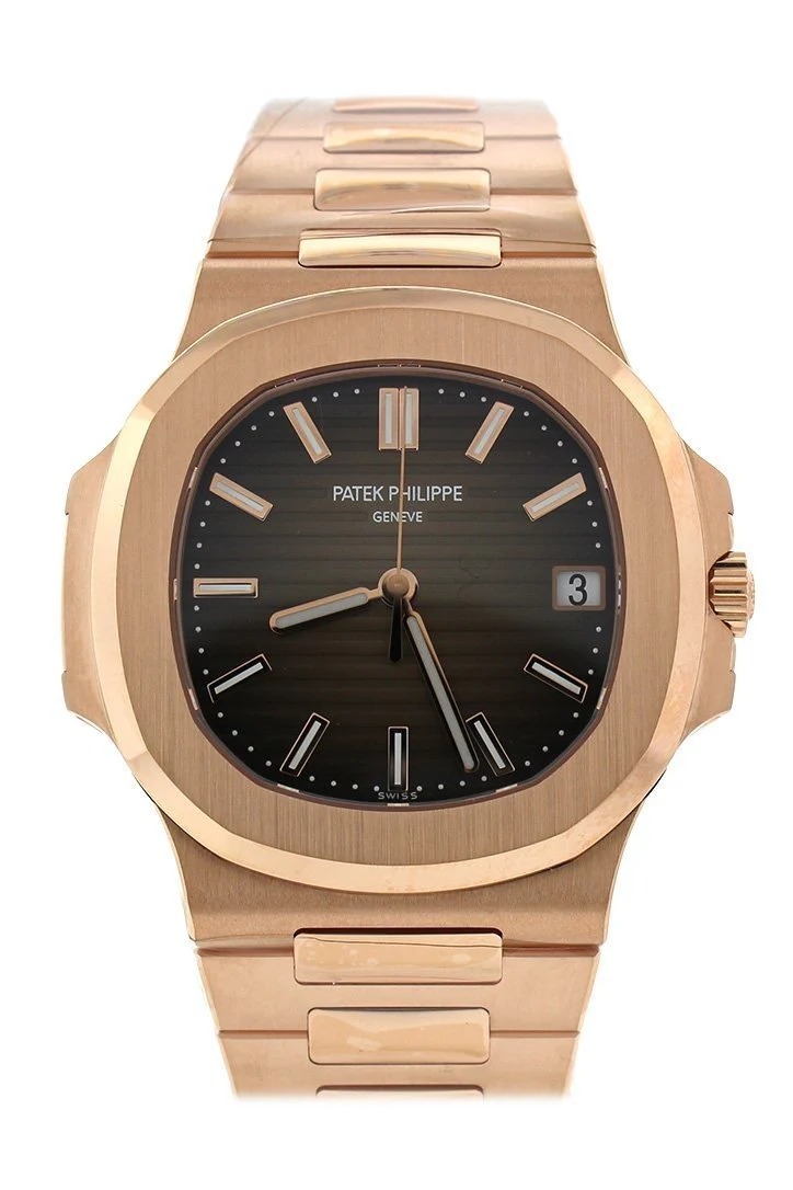 18k rose gold case with a 18k rose gold bracelet. Fixed bezel. Brown dial with rose gold-tone hands and index hour markers. Minute markers around the outer rim. Dial Type: Analog. Luminescent hands and markers. Date display at the 3 o'clock position. Automatic movement. 324 s c engine. Scratch resistant sapphire crystal. Screw down crown. Skeleton transparent exhibition see through case back. Case diameter: 43 mm x 38 mm. Cushion case shape. Deployment clasp. Water resistant at 120 meters / 400 feet. Functions: date, hour, minute, second. Additional Info: 29 jewels. Luxury watch style. Watch label: Swiss Made. Patek Philippe Nautilus Brown Dial 18K Rose Gold Automatic Mens Watch 5711-1R-001.