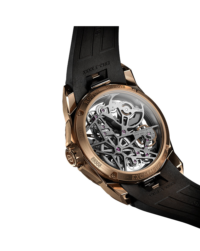 Excalibur Monobalancier - Automatic, Rose Gold case - 42mm - Black Leather strap - Dial- Grey double surface flange with transferred texts and minute track, polished and Pink gold plated hour markers with SLN in the center. CLASP - Pink gold cover with steel blades, triple folding, interchangeable with Quick Release System - QRS Type: Pink Gold 18K.Water Resistance: 10 bar (100 m)