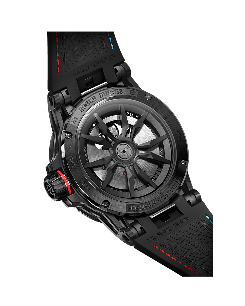 Lamborghini, the super car manufacturer from Italy, and ROGER DUBUIS HYPERWATCH™ manufacturer from Geneva, teamed up and unleashed their creativity to release audacious timepieces born to race. The result are watches with unique calibres built like engines. Inspired by Lamborghini, Roger Dubuis developed high technological innovations, offering to its exclusive tribes models evoking the uncompromised machines made by the Italian brand of the bull. The collaboration is also the genesis of unique projects where the client sits with the manufacturer to create his or her very own watch. CASE-Black DLC titanium case Titanium bezel with lacquered markings and sapphire crystal with anti-reflective coating Black DLC titanium open case back with sapphire crystal Black DLC titanium crown with red lacquered ring, Size: 45mm, Water Resistance: 5 bar, DIAL-White lower flange with transferred texts and minute tracks. Black upper Flange with screw-like hour markers rhodium plated and filled with SLN. Main material: Titanium, STRAP- Black rubber with white perforated leather inlay, inner color of the holes is dark blue, light blue and red, interchangeable with Quick Release System - QRS White Leather CLASP Black DLC titanium cover with titanium blades, triple folding, interchangeable with Quick Release System - QRS Type: Titanium