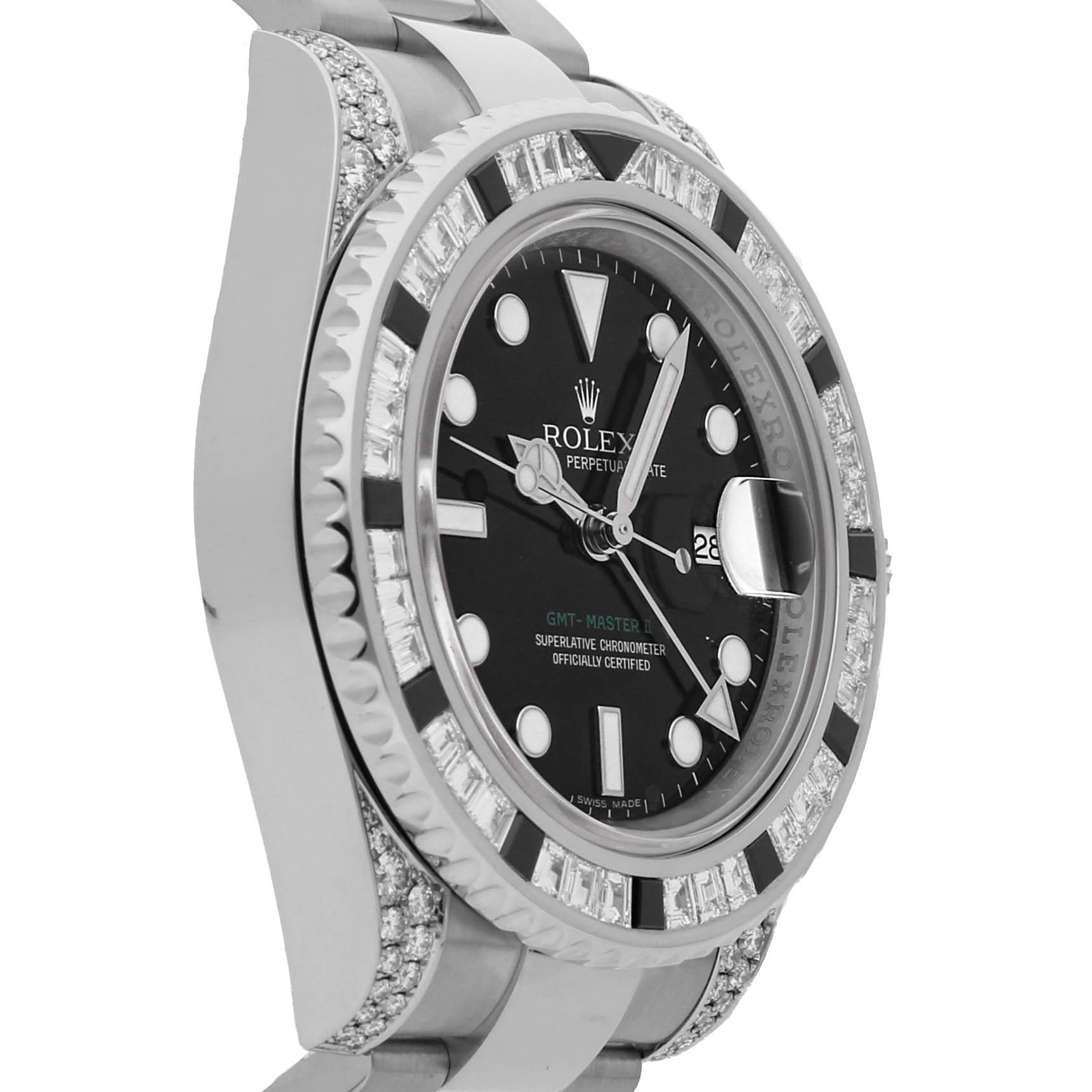 Pre-Owned Rolex GMT-Master II (116759SANR) self-winding automatic watch, features a 40mm 18k white gold case with a sapphire and diamond bezel and lugs surrounding a black dial on an 18k white gold Oyster bracelet with folding buckle. Functions include hours, minutes, seconds, date and GMT. This watch does not come with box or papers. M Serial.We back this watch with a 2-Year WatchBox warranty!This watch will be ready to ship in 5-7 days!