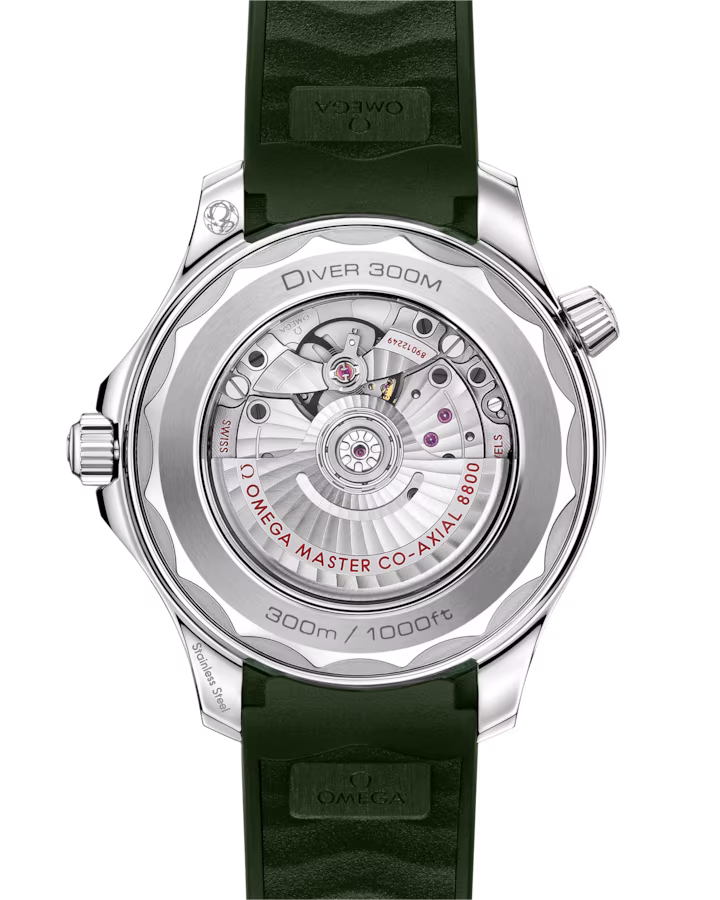 The watch is presented on a green rubber strap and is driven by the OMEGA Master Chronometer Calibre 8800, which can be seen through the sapphire-crystal on the wave-edged caseback.