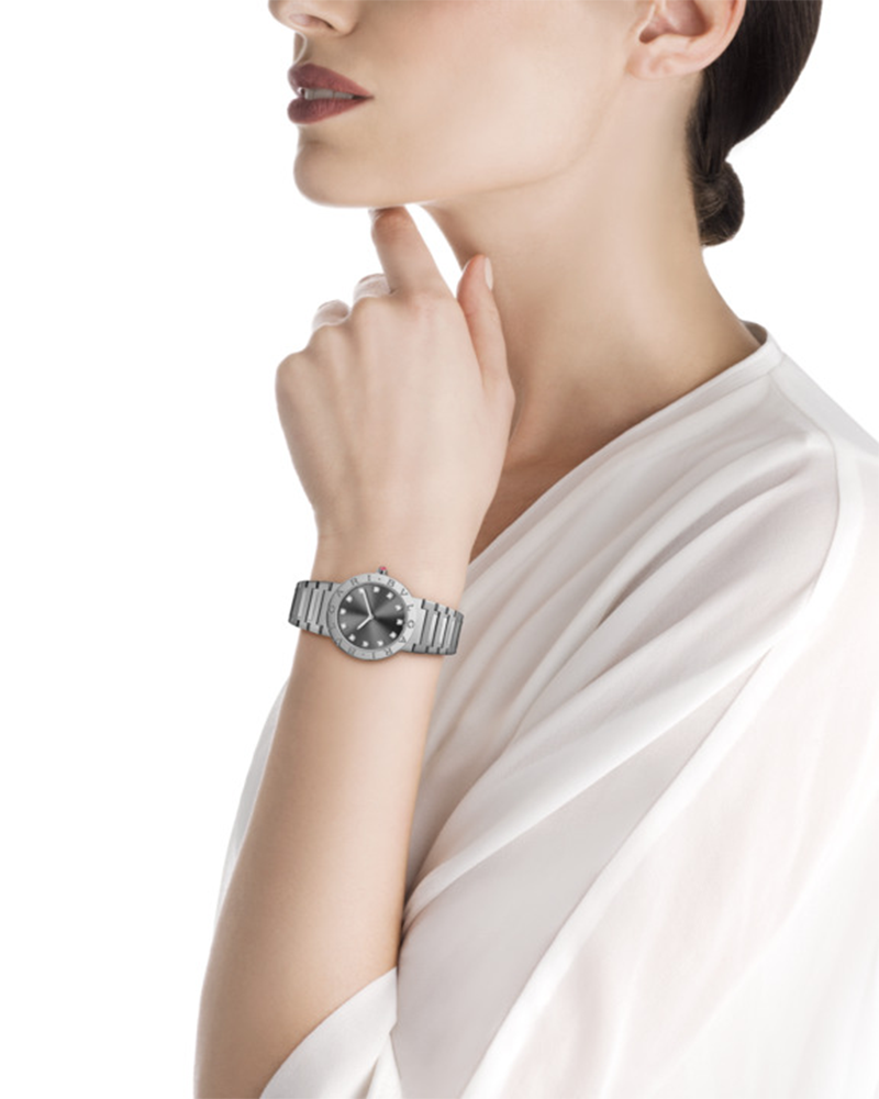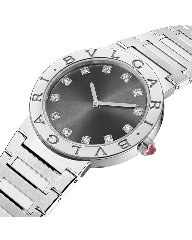 The timeless BVLGARI BVLGARI LADY watch embodies more than 40 years of bold creativity and distinctive style. In 1977, the Roman Maison launched the first BVLGARI BVLGARI LADY timepiece featuring the emblematic circular signature: from the very first moment this creation made its historic entrance into the exclusive circle of enduring watch models, beyond the reach of time. The double logo, inspired by the curved inscriptions on ancient Roman coins, epitomizes still today Bvlgari’s unparalleled ability to fuse culture and modernity into timeless creations. BVLGARI BVLGARI LADY watch with quartz movement, 33 mm stainless steel case, stainless steel bezel with logo, stainless steel crown with a synthetic cabochon-cut rubellite, anthracite satiné soleil lacquered dial, diamond indexes and stainless steel bracelet.