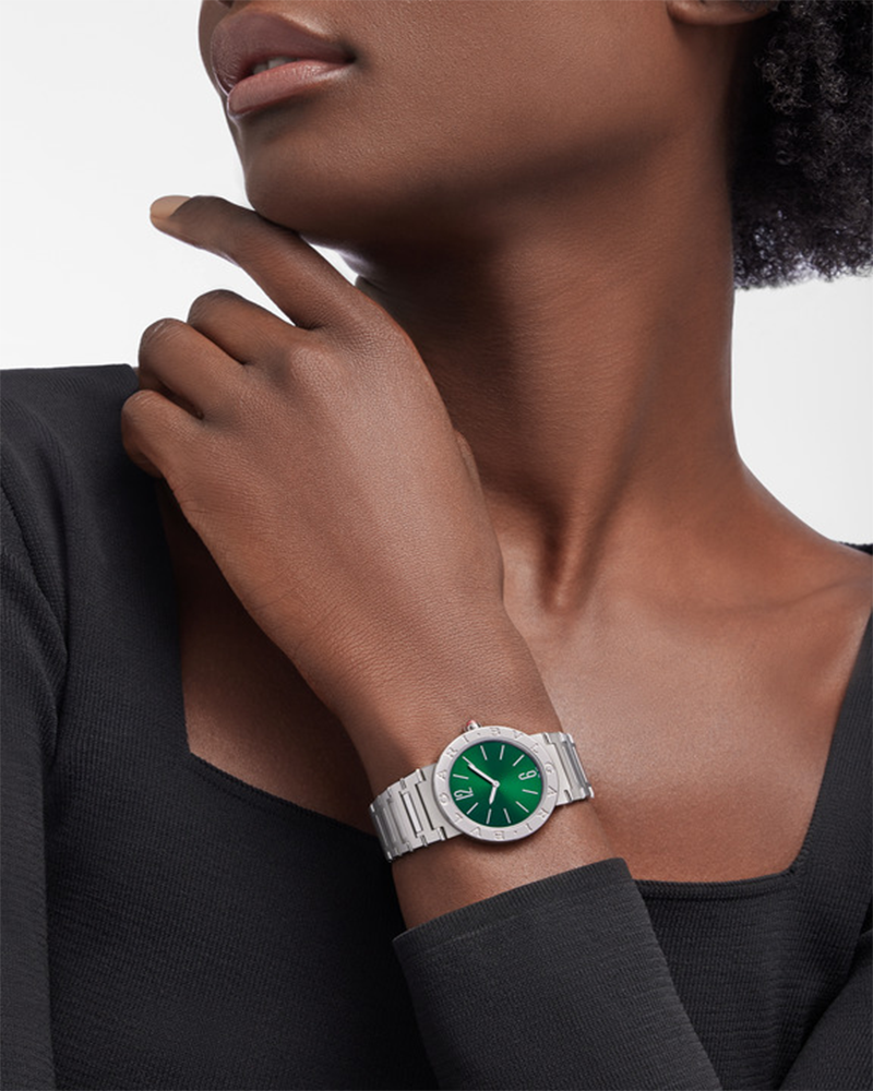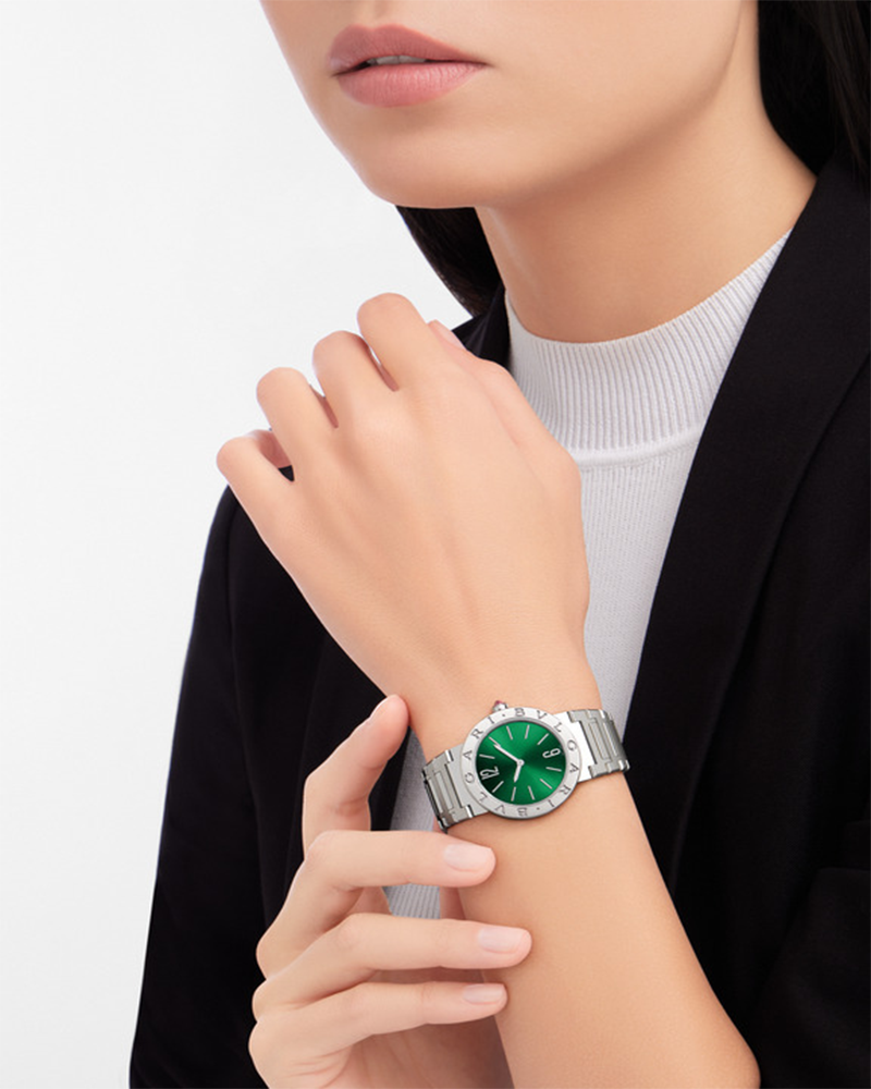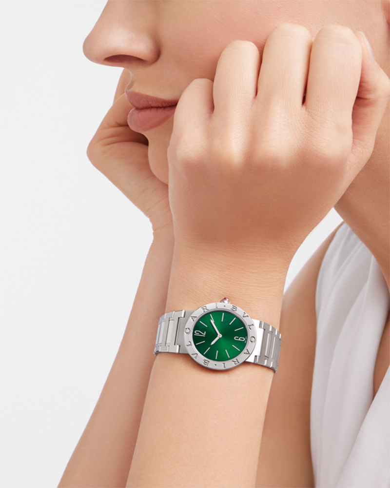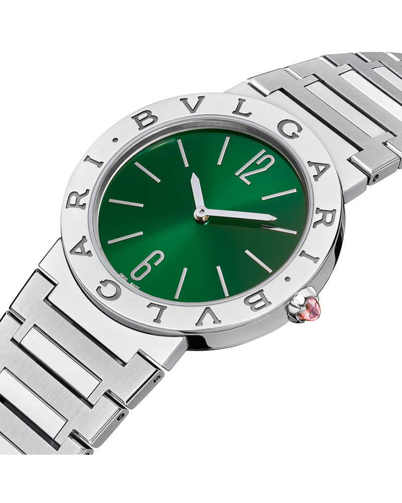 Bvlgari has been reinventing classic inspirations into pioneering designs for over 40 years. BVLGARI BVLGARI was the very first watch to use a logo as an element of design, an exquisite example of the brand’s creativity and craftsMenship. A front runner in today’s “logoMenia” movement; the distinctive double circular engraving was initially inspired by the curved inscriptions on ancient coins, growing from the RoMen roots of the brand into an elegant fusion of culture and modernity, a true representation of everyday glamour. BVLGARI BVLGARI Lady watch with quartz movement, 33 mm stainless steel case, stainless steel bezel with logo, stainless steel crown set with synthetic cabochon-cut rubellite, green sun-brushed dial, date window and stainless steel bracelet.