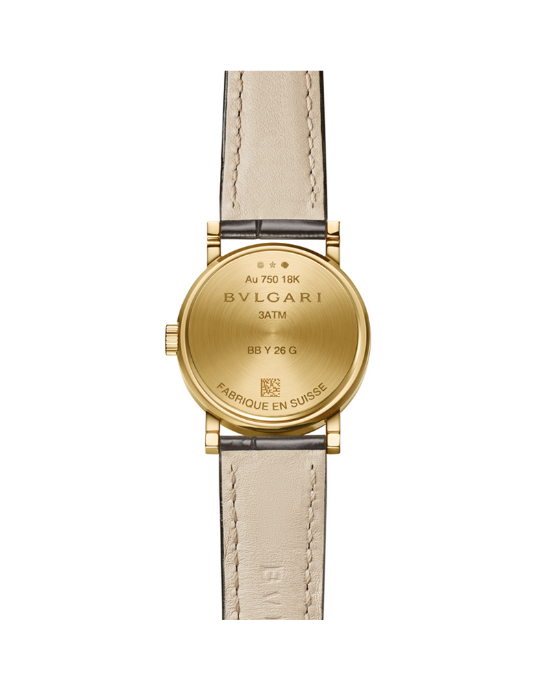 BULGARI BULGARI watch with quartz movement, hours and minutes functions, 26 mm 18 kt yellow gold case, 18 kt yellow gold bezel engraved with double logo, black opaline dial, gold-coloured hands and indexes, 18 kt yellow gold crown, black leather stitched bracelet, and 18 kt yellow gold ardillon buckle. Water-resistant up to 30 metres.
