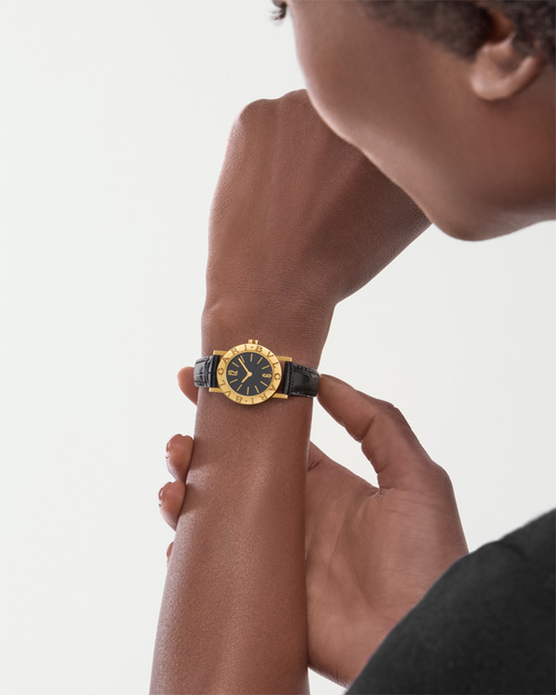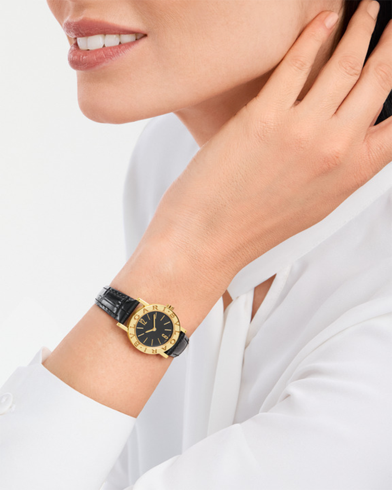 A reinterpretation of the iconic model first launched in 1977, the timeless BULGARI BULGARI watch with an 18 kt yellow gold case and black leather bracelet embodies a story of bold creativity and innovative Italian style. Inspired by the curved inscriptions on ancient Roman coins, the unmistakable double logo engraved on the bezel propelled the brand's name to the status of iconic design Maison, for a watch that sparked a revolution and remains a powerful reference point that transcends both time and trends. In an elegant play on contrasts, the black opaline dial is lit by gold-coloured hands and indexes.