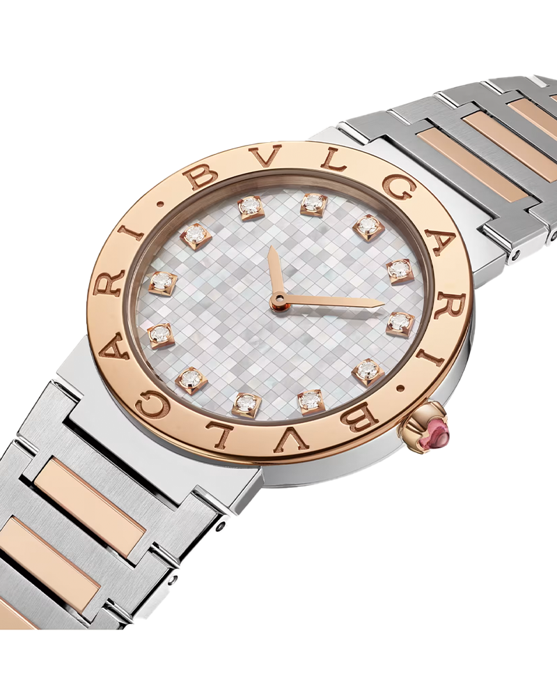 Bvlgari Bvlgari x LISA watch with quartz movement, hours and minutes functions, 33 mm stainless steel case, 18 kt rose gold bezel engraved with double logo, white mother-of-pearl mosaic dial, 12 round brilliant-cut diamond indexes, 18 kt rose gold crown set with a cabochon-cut pink rubellite, personalised caseback with edelweiss engraving, and stainless steel and 18 kt rose gold bracelet with folding buckle. Water-resistant up to 30 metres. Limited edition of 850 pieces.