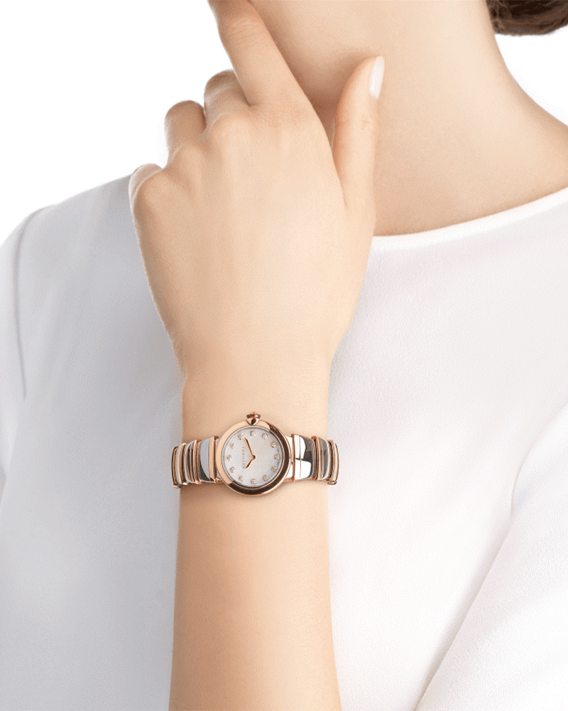 Inspired by the inextricable link of light and time, LVCEA pays tribute to the sundial, one of the oldest timekeeping instrument rooted in ancient Roman tradition. Capturing the power of light, or “luce” in Italian, LVCEA shines with the radiance of its round case featuring a sundial face, to wind history with modernity. A colourful gemstone is set in the crown of every timepiece, as unmistakable trademark of the Roman Jeweler. LVCEA watch with quartz movement, 28 mm 18 kt rose gold and stainless steel case, 18 kt rose gold crown set with synthetic cabochon-cut rubellite and diamond, white mother-of-pearl dial, diamond indexes, 18 kt rose gold and stainless steel bracelet.