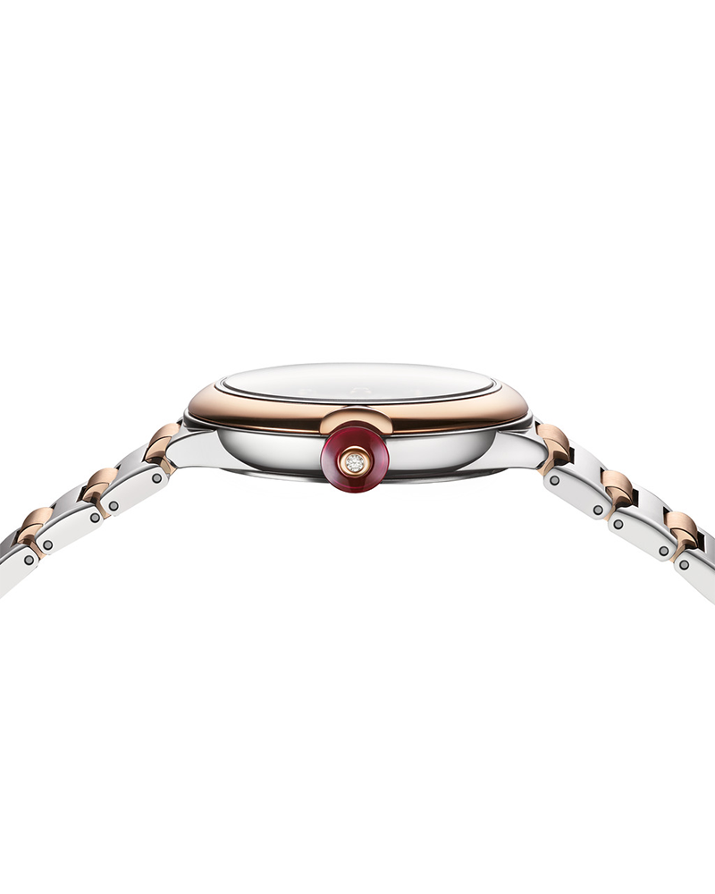 Lvcea watch with automatic movement, hours, minutes and seconds functions, 33 mm polished stainless steel case, 18 kt rose gold bezel, white mother-of-pearl intarsia marquetry dial, 12 round brilliant-cut diamond indexes, stainless steel crown set with a synthetic cabochon-cut rubellite and a diamond. 18 kt rose gold and polished, satin-brushed stainless steel bracelet with folding buckle. Water-resistant up to 50 metres.