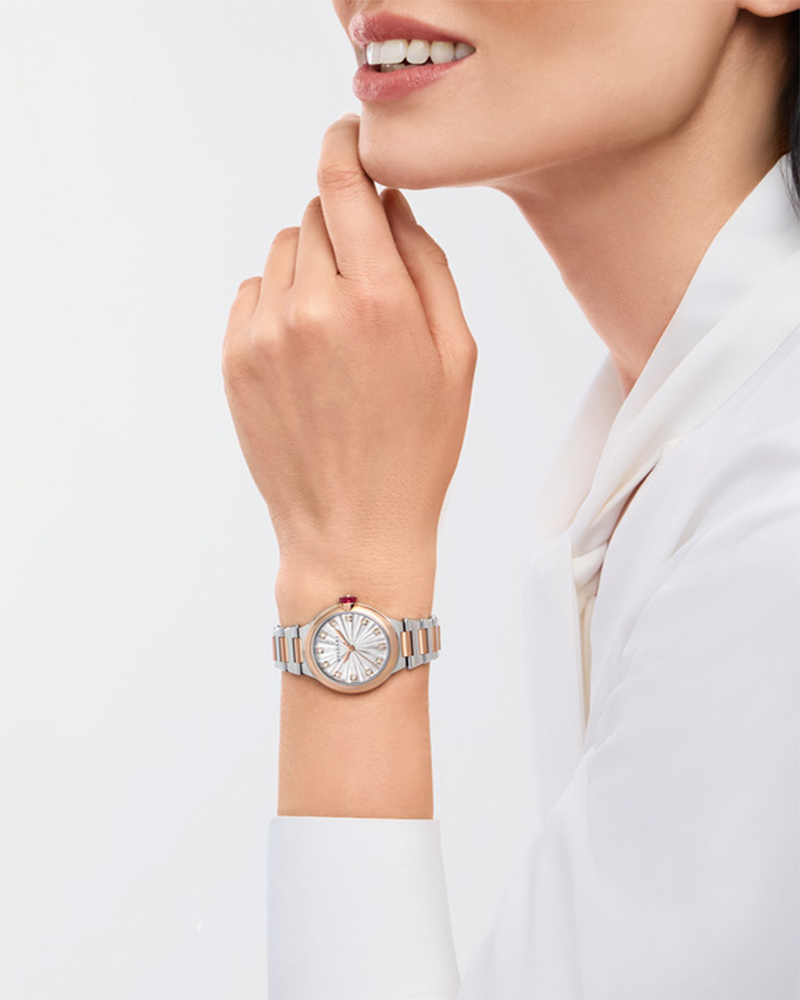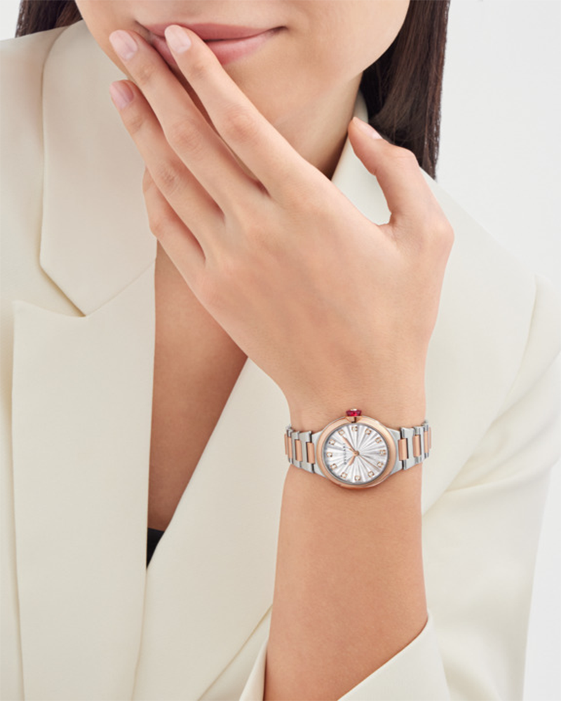A symbol of radiant and modern femininity, the Lvcea watch brings a touch of glamour to your style and everyday life. Infused with exceptional artistry, this timepiece in 18 kt rose gold and polished, satin-brushed stainless steel displays the integral bond between Bulgari’s jewellery savoir-faire and watchmaking expertise. Its three-dimensional dial, embellished with diamond indexes, is crafted with white mother-of-pearl elements, faceted and assembled one by one to evoke the rays of the sun, using a classic métiers d’art technique inspired by “intarsia”.