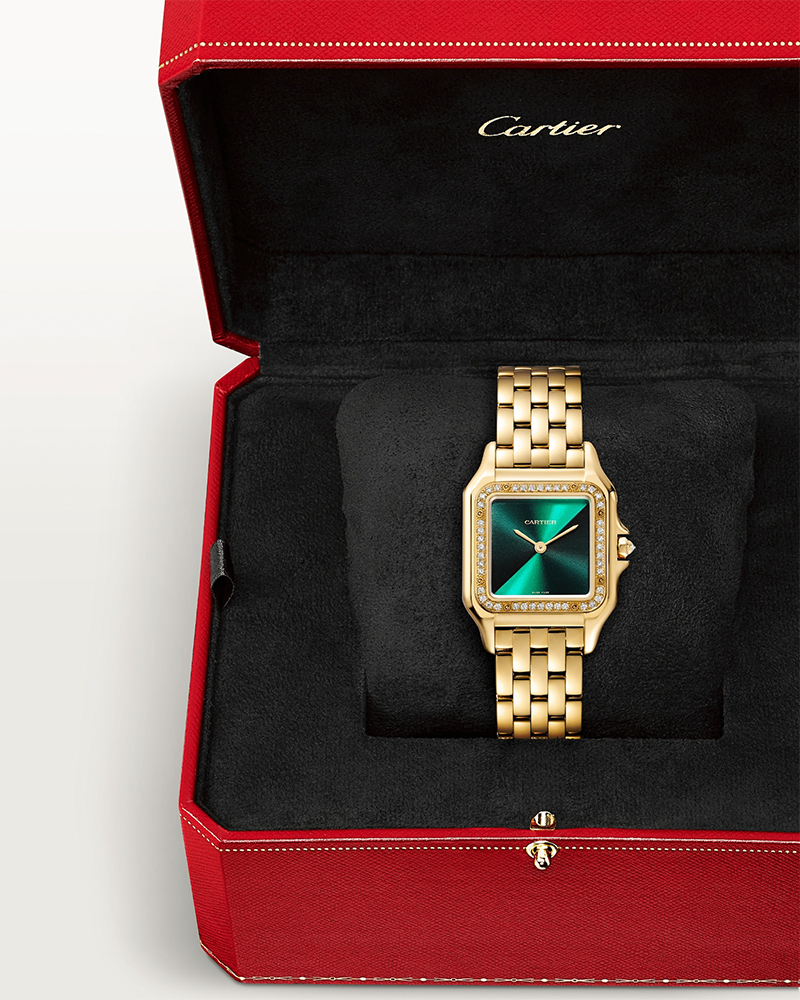 Panthère de Cartier watch, medium model, quartz movement. Case and crown in yellow gold 750/1000 set with 45 brilliant-cut diamonds totaling 0.31 carats. Dimensions: 1” x 1.5”, thickness: 0.24”, dial with graduated shades from bright green to dark green forming a diagonal in the center, sword-shaped hands, yellow gold 750/1000 bracelet. Water-resistant up to 3 bar (approx. 30 meters/100 feet).