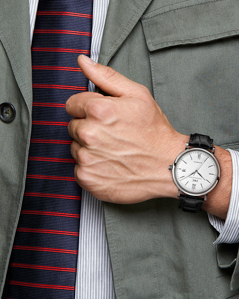 PORTOFINO AUTOMATIC - The Portofino Automatic with a silver-plated dial and black leather strap is optionally available with a Milanaise mesh bracelet in stainless steel. The solid, mechanical automatic movement reliably ticks away the time. The evenly rounded sides of the 40-millimetre stainless-steel case make it appear even slimmer.