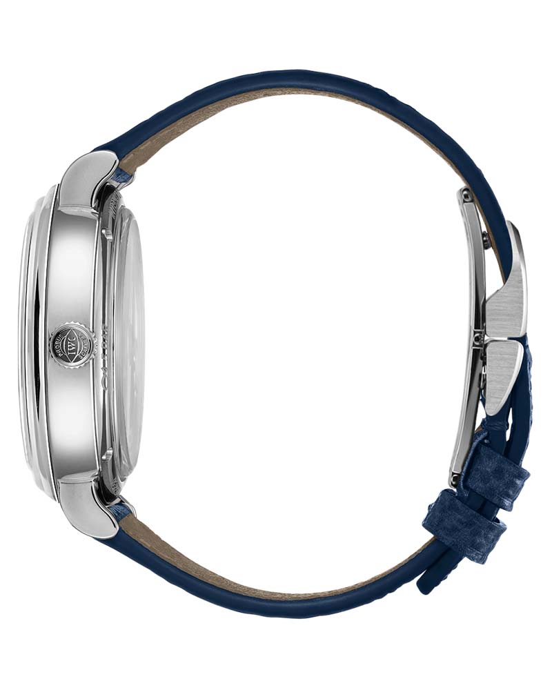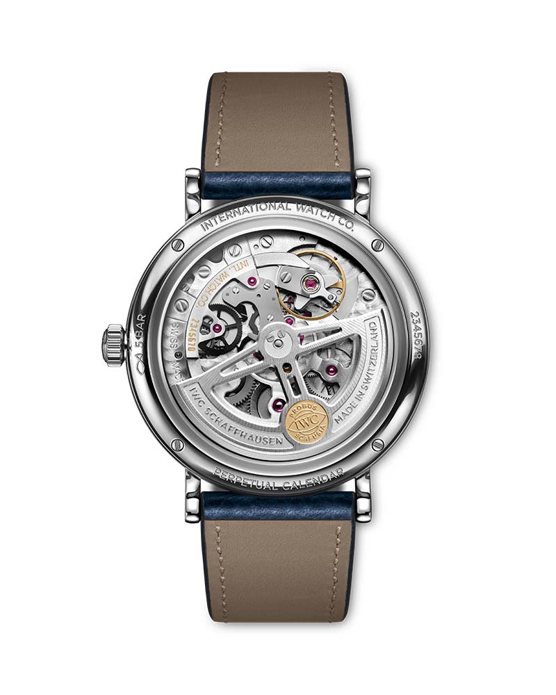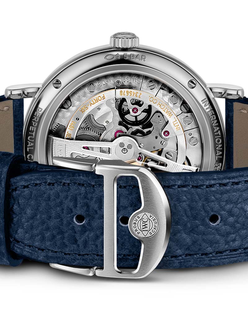 The Portofino Perpetual Calendar features the legendary perpetual calendar developed by Kurt Klaus during the 1980s. At 40 millimeters, the Portofino Perpetual Calendar is the smallest perpetual calendar in IWC’s portfolio. This version features stainless steel case, a silver-plated dial, and gold-plated hands and appliques, marking the first time the perpetual calendar is available in stainless steel in the Portofino collection. IWC’s legendary perpetual calendar was originally engineered during the 1980s by the brand’s former head-watchmaker, Kurt Klaus. The ingenious mechanism is mechanically programmed to recognize the different lengths of the months as well as the leap years. It will run without any adjustments until the year 2100. The calendar information is displayed in three sub dials at 3, 6, and 9 o’clock. Made of solid gold, the moon phase indication shows the moon against the backdrop of a star-studded night sky. Thanks to a special reduction gear train, it is so precise that it will only deviate by one day from the orbit of Earth’s satellite after 577.5 years. Through the transparent sapphire glass back, one can catch a glimpse of the IWC-manufactured 82650 caliber. Engineered with a focus on robustness and precision, this high-end automatic movement features IWC’s Pellaton winding system, which has been reinforced with ceramic components and builds up a power reserve of 60 hours. This exclusive timepiece is fitted with a blue leather strap with a butterfly clasp.