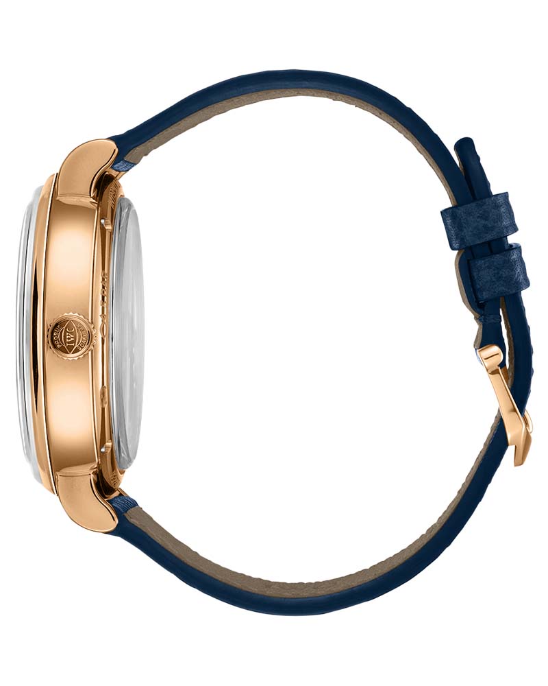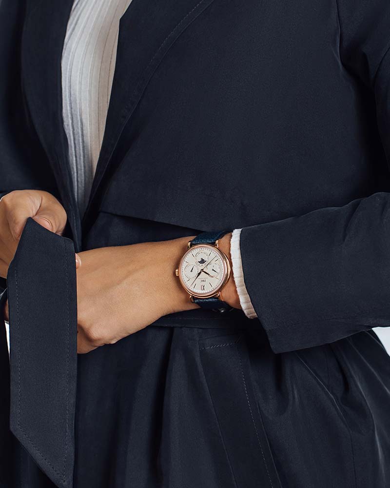 The Portofino Perpetual Calendar features the legendary perpetual calendar developed by Kurt Klaus during the 1980s.At 40 millimetres, the Portofino Perpetual Calendar is the smallest perpetual calendar in IWC’s portfolio. This version features an 18-carat 5N gold case, a silver-plated dial, and gold-plated hands and appliques. IWC’s legendary perpetual calendar was originally engineered during the 1980s by the brand’s former head-watchmaker, Kurt Klaus. The ingenious mechanism is mechanically programmed to recognize the different lengths of the months as well as the leap years. It will run without any adjustments until the year 2100. The calendar information is displayed in three subdials at 3, 6, and 9 o’clock. Made of solid gold, the moon phase disc shows the moon against the backdrop of a star-studded night sky. Thanks to a special reduction gear train, it is so precise that it will only deviate by one day from the orbit of Earth’s satellite after 577.5 years. Through the transparent sapphire glass back, one can catch a glimpse of the IWC-manufactured 82650 calibre. Engineered with a focus on robustness and precision, this high-end automatic movement features IWC’s Pellaton winding system, which has been reinforced with ceramic components and builds up a power reserve of 60 hours. This exclusive timepiece is fitted with a blue leather strap with a butterfly clasp.